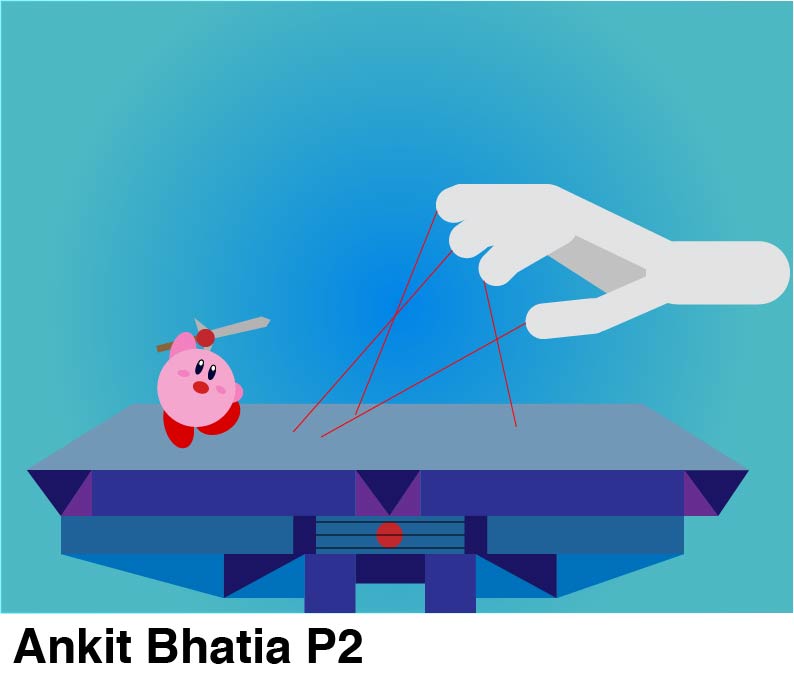 I took inspiration for this from the first video game I fully finished: Super Smash Bros: Brawl on the Nintendo Wii. This scene shows Kirby fighting the Master Hand, who was the final boss in the story mode. This image was made using only simple shapes such as circles, rectangles, and triangles.